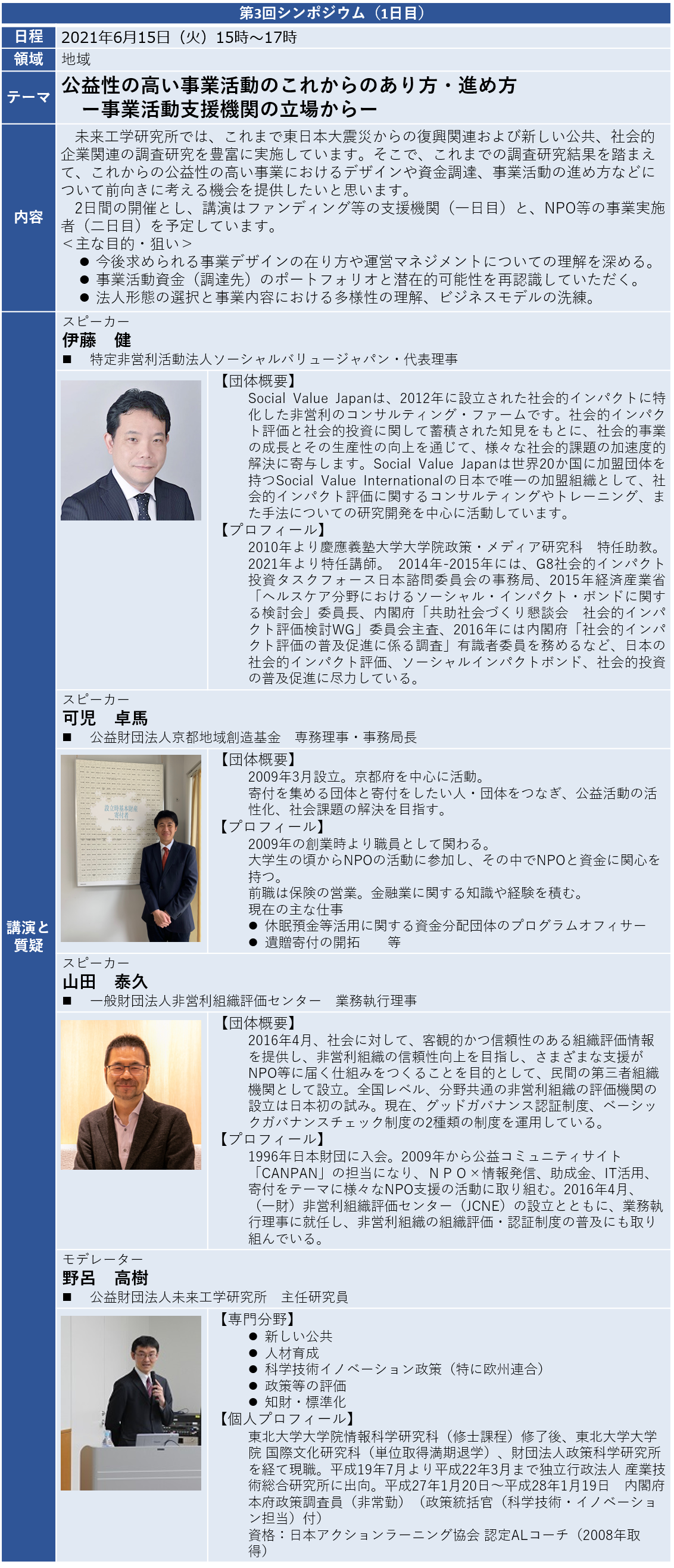 連続シンポジウムの第3-1回、「公益性の高い事業活動のこれからのあり方・進め方 -事業活動支援機関の立場から-」 は2021年6月15日(火)に開催致しました。現在Youtubeにて録画動画がご覧になれます。